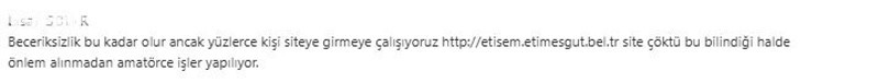 Bazı vatandaşlar ise, siteye uzun süredir erişememekten dolayı belediyeye ulaşmakta güçlük çektiklerini belirtiyor. Özellikle fatura sorgulama, izin başvurusu ve çeşitli başvuru formlarına erişememek, işlemlerin gecikmesine ve vatandaşların zaman kaybına yol açıyor.