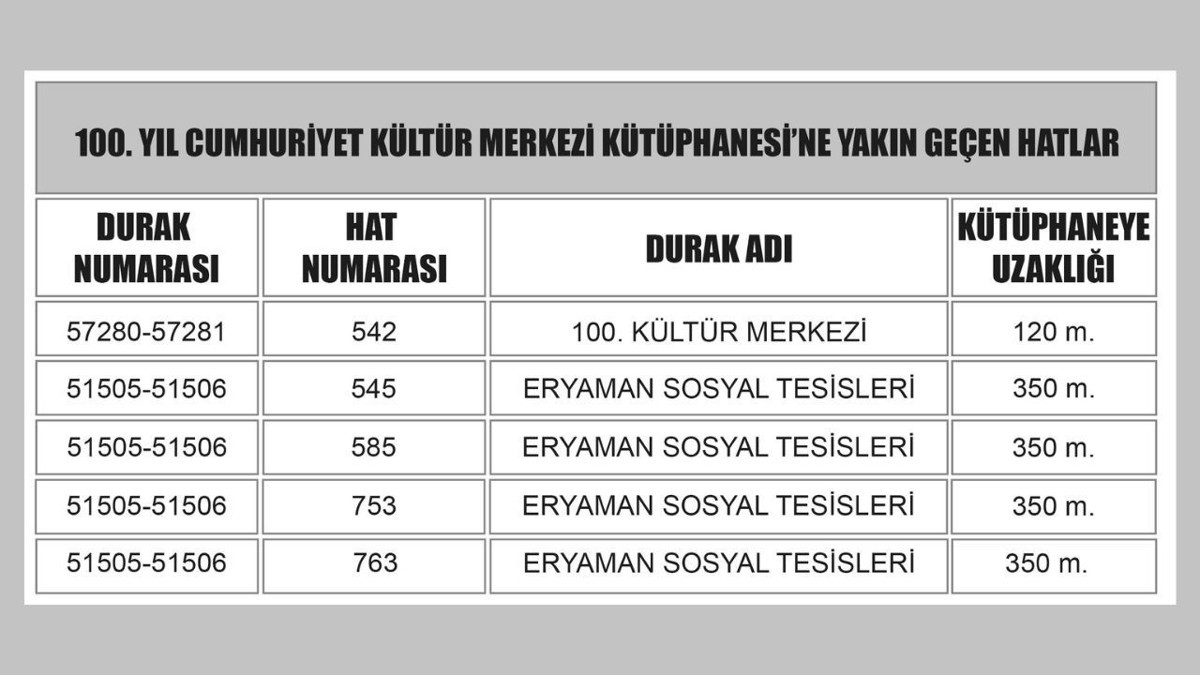 Altay Mahallesi Ertuğrulbey Caddesi adresinde bulunan 100. Yıl Cumhuriyet Kültür Merkezi Kütüphanesi, haftanın altı günü ziyaretçilerini ağırlıyor. Kütüphane, Salı’dan Pazar’a 09.00–22.00 saatleri arasında açık olup Pazartesi günleri kapalıdır.