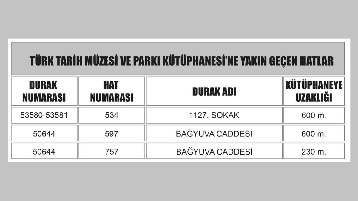 Bağlıca Mahallesi Kızılelma Caddesi No:1 adresinde bulunan Türk Tarih Müzesi Kütüphanesi, ziyaretçilerine hafta boyunca hizmet sunuyor. Kütüphane, Salı’dan Pazar’a 09.00–18.00 saatleri arasında açık olup Pazartesi günleri kapalıdır.