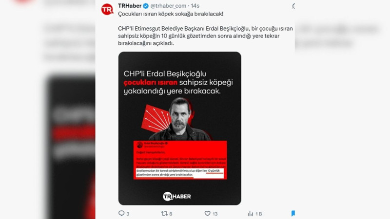 Bahsi geçen paylaşım, Erdal Beşikcioğlu, Ağustos ayında Yapracık Mahallesi’nde yeşil küpeli (sahipsiz, kayıtlı) bir sokak hayvanının bir çocuğu ısırması üzerine yapılmıştı.