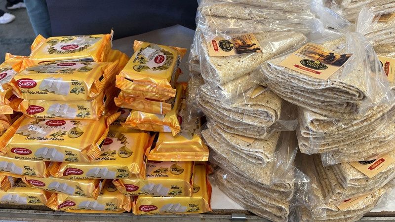 Fuarda satılan ürünler hakkında bilgi veren Bayram, tahin helvasının çeşitlerini ve fiyatlarını şu şekilde sıraladı: