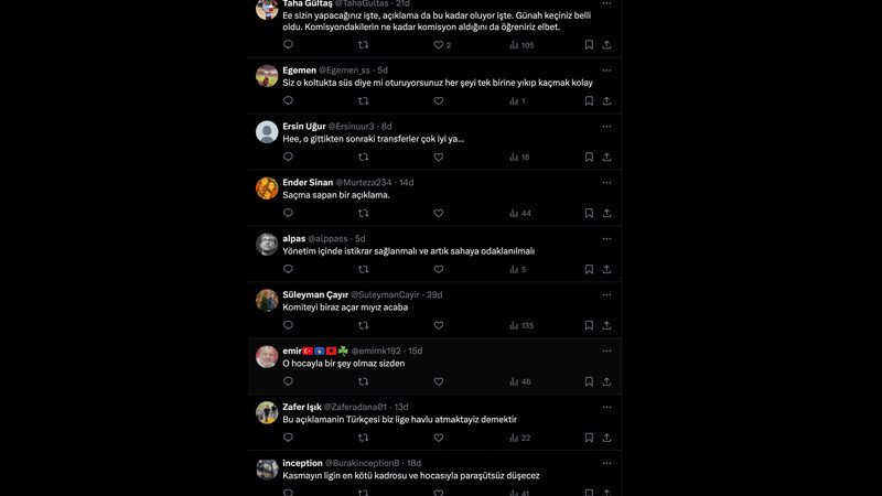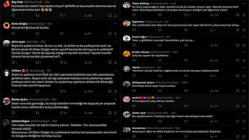 Düzgün'ün istifasının kabul gerekçesiyle birlikte açıklanmasının ardından Kırmızı Karaların resmi hesabının altına taraftarlardan yorum yağdı.