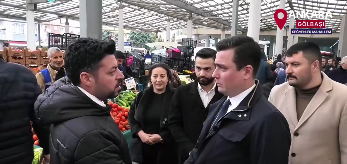 Gölbaşı İlçe Başkanı Selim Akceylan ve teşkilat üyeleriyle birlikte sahaya inen Gökçek, vatandaşın nabzını tuttu. Ancak Pazar yerindeki sohbet, bir vatandaşın ulaşım isyanıyla siyasi bir eleştiriye dönüştü.