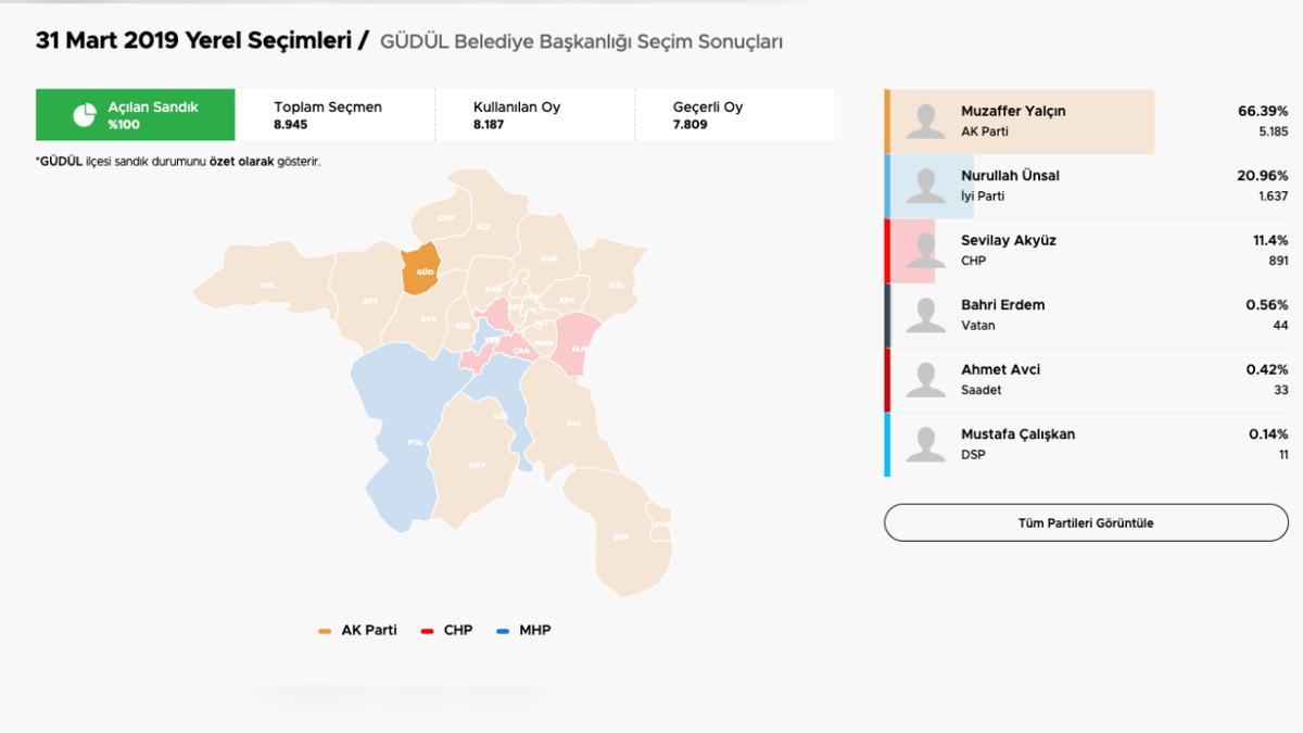 Seçimde, İyi Parti adayı Nurullah Ünsal yüzde 20.96 (bin 637 oy) ile ikinci sırada yer alırken, Cumhuriyet Halk Partisi (CHP) adayı Sevilay Akyüz ise yüzde 11.4 (891 oy) oy oranıyla üçüncü oldu. Bu sonuçlar, 2019'da Güdül seçmeninin büyük bir çoğunlukla AK Parti lehine oy kullanarak güçlü bir destek verdiğini göstermiştir.