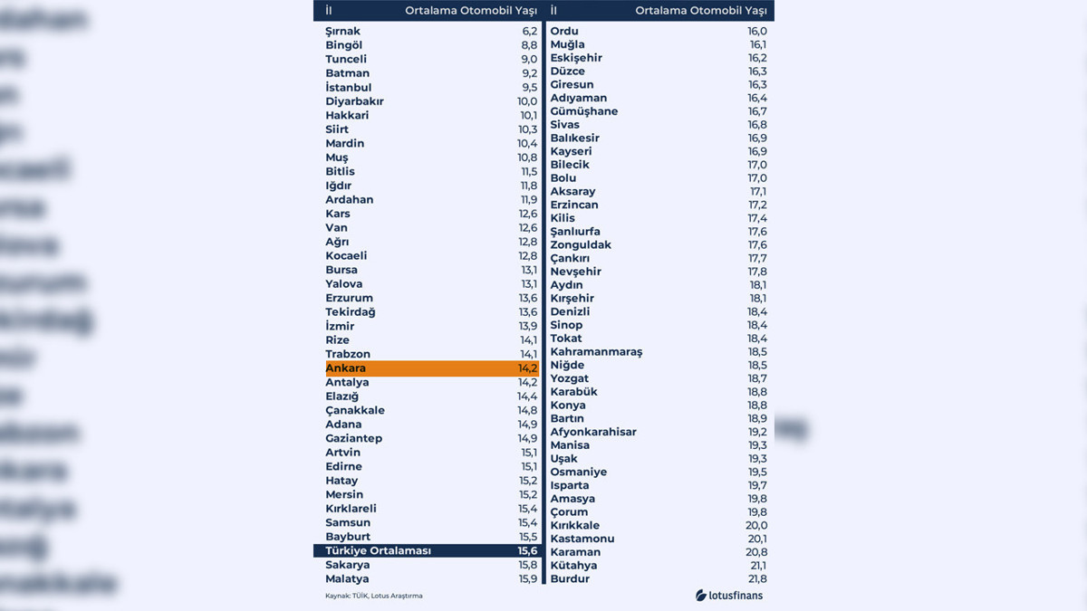 Sonuç olarak tabloya bakıldığında Ankara, ortalama araç yaşı sıralamasında 81 il arasında 25'inci sırada yer alıyor.