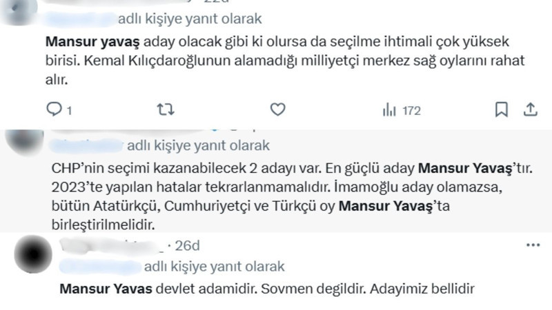 Sosyal medyada öne çıkan yorumlarda, “Mansur Yavaş aday olacak gibi ki olursa da seçilme ihtimali çok yüksek birisi. Kemal Kılıçdaroğlu’nun alamadığı milliyetçi merkez sağ oylarını rahat alır” ifadeleri yer aldı.