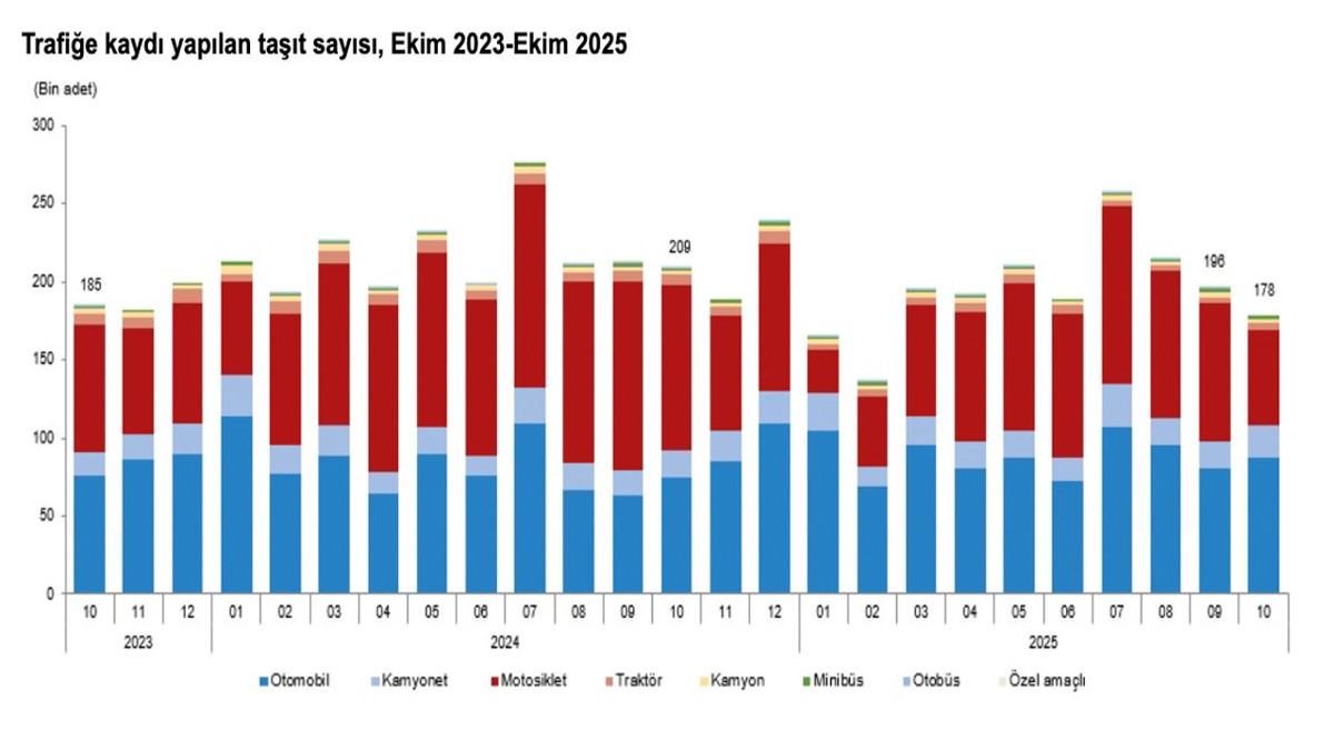 Türkiye İstatistik Kurumu (TÜİK), Ekim 2025 Motorlu Kara Taşıtları verilerini yayımladı. Buna göre ekim ayı içinde 178 bin 481 aracın trafiğe kaydı yapıldı. Yeni kayıtların yarısını otomobiller oluştururken, motosikletlerdeki düşüş dikkat çekti. Trafiğe kaydı yapılan taşıt sayısı bir önceki aya göre yüzde 9,1 azaldı. Peki Ankara'da trafikteki araçların sayısında ne gibi değişim yaşandı?