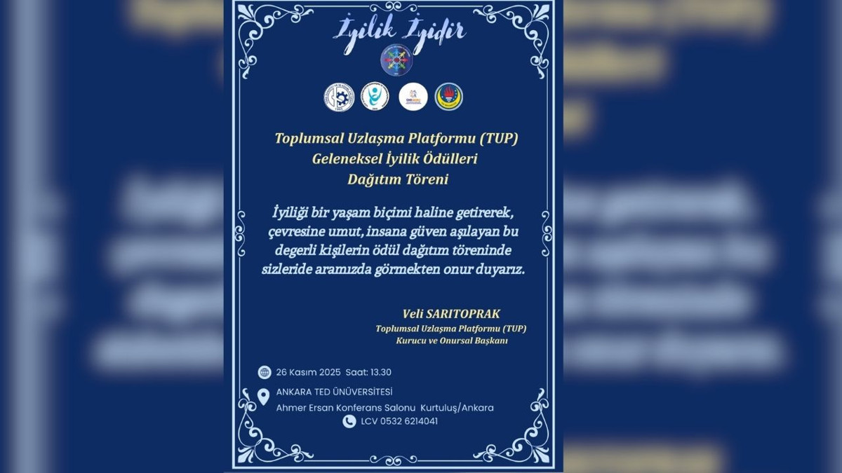 Toplumsal Uzlaşma Platformu (TUP), iyiliği bir yaşam biçimi haline getirerek çevresine umut ve insanlara güven aşılayan değerli isimleri onurlandırmaya hazırlanıyor. Platformun geleneksel hale gelen "İyilik Ödülleri Dağıtım Töreni" bu yıl da Ankara'da düzenlenecek.