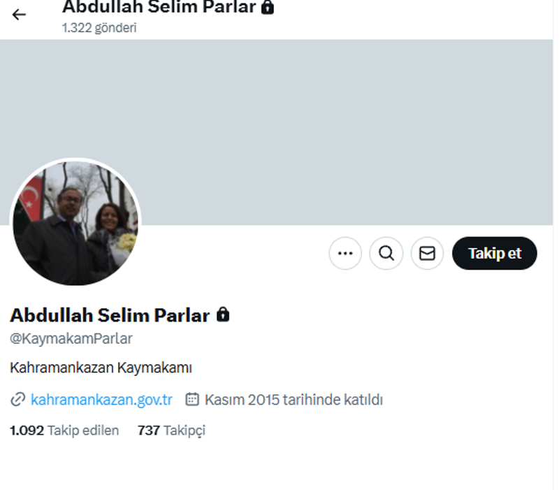 Bin 92 kişiyi takip eden Kaymakam Parlar’ın, 737 takipçisi bulunuyor. Gizlilik ayarları nedeniyle, kamuya açık bir paylaşım yapılmaması oldukça dikkat çekici.