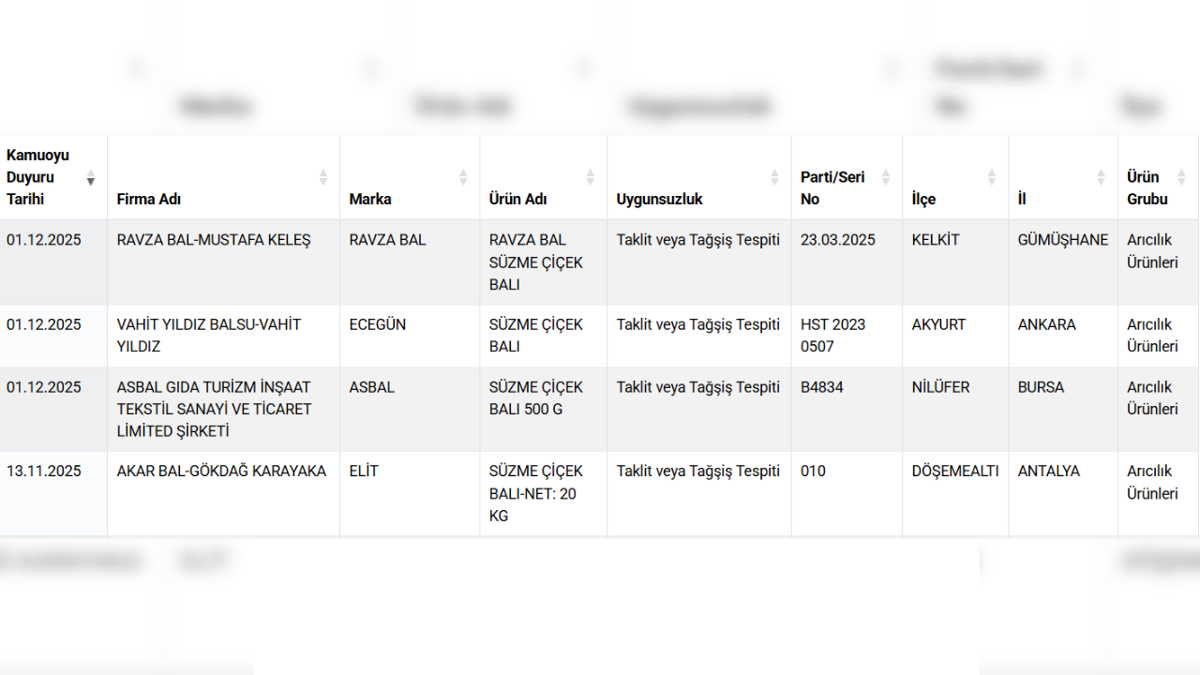 Bakanlığın 1 Aralık tarihli duyurusunda yer alan bilgilere göre, Ankara Akyurt ilçesinde faaliyet gösteren Vahit Yıldız Balsu - Vahit Yıldız firmasına ait "Ecegün Süzme Çiçek Balı" ürününde taklit veya tağşiş yapıldığı kesinleşti. Parti numarası "HST 2023 0507" olan üründe, balın doğasına aykırı maddeler tespit edildi.