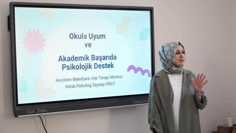 Keçiören Belediyesinin düzenlediği ‘Okula Uyum ve Ailenin Rolü’ seminerinde, velilere çocukların okula uyum süreci, ayrılık kaygısı, sosyal ilişkiler ve akademik başarıya katkı sağlayacak yöntemler anlatıldı. Öğretmen-veli iş birliğinin önemi de vurgulandı.