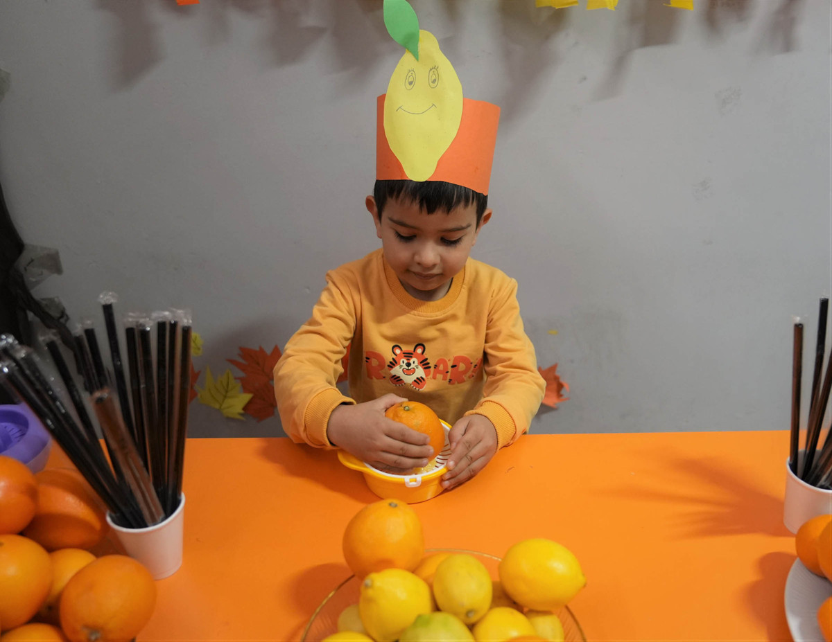 Etkinlik boyunca çocukların doğal besinlere ilgi göstermesini hedefleyen öğretmenler, portakal sıkma atölyesinin ardından miniklere meyve ve sebzelerin vücut için sağladığı yararları örneklerle anlattı.