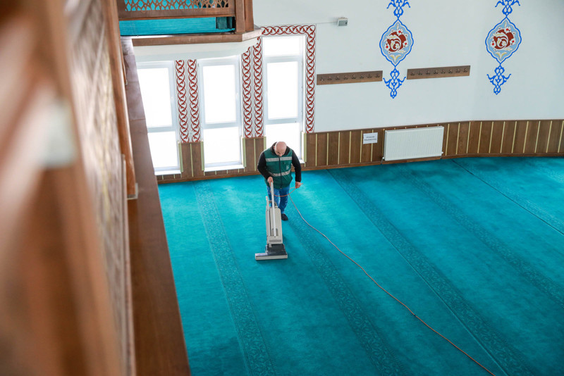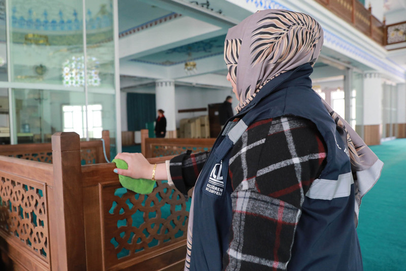 Halılar, minberler, avizeler ve lavabolar gibi pek çok alan detaylı bir şekilde dezenfekte edilerek, ibadet alanlarına gül suyu serpilerek ferah bir atmosfer yaratılıyor.