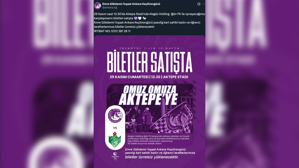 Maç öncesi Emre Gökdemir İnşaat Ankara Keçiörengücü tarafından yapılan bir diğer duyuru da passolig kart sahibi kadın ve öğrenci taraftarlara biletlerin ücretsiz yükleneceği oldu.