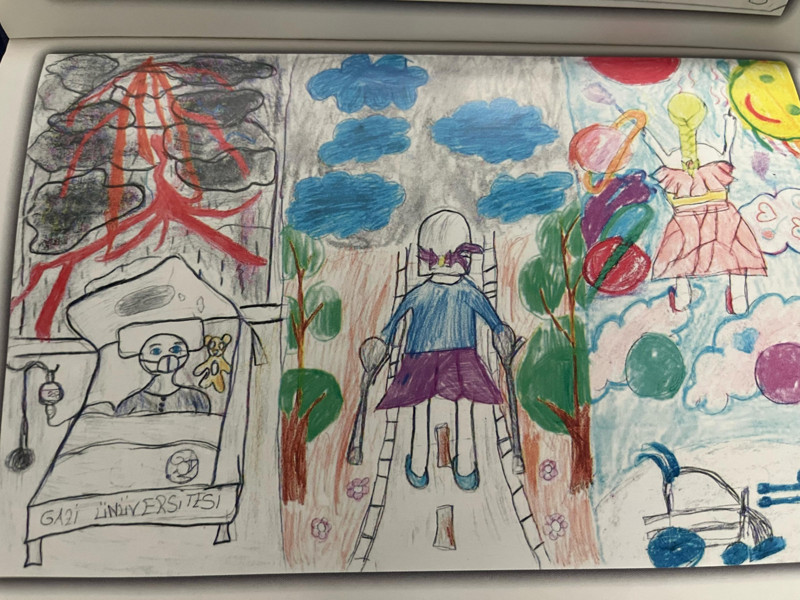 Hastalığını en iyi anlatan çizimi ise kendi yaşam mücadelesini simgelediğini söyleyen Karakuş, “Resimde, önce hastalığın başlangıcında yürüyemeyen bir figür var. Sonra bastonlarla yürüdüğüm dönem ve en sonunda özgürce koşan bir kız çizdim. Şu an hâlâ bastonlarla yürüyorum ama inanıyorum ki bir gün onları bırakıp özgürce yürüyeceğim” dedi.