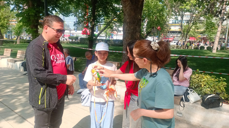 Caique cinsi papağan Alvin, bayramda Kızılay'da ilgi odağı oldu. Sahibinin omzunda gezintiye çıkan oyuncu kuş, dans edip takla atarak görenleri kendine hayran bıraktı.