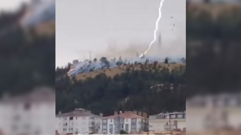 Yıldırım düşmesi sonucu çıkan yangın büyüyerek devam etti. Alevler yükselirken aynı noktaya bir kez daha yıldırım düştü. O anlar, çevredeki vatandaşların cep telefonu kamerasına yansıdı.