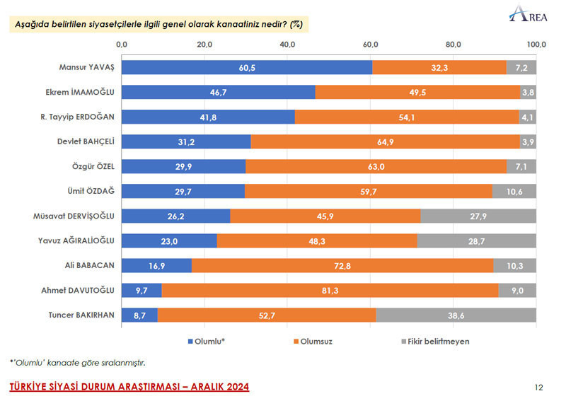 Ankette katılımcılara "Siyasetçilerle ilgili genel olarak kanaatiniz nedir?" sorusu yöneltildi. Katılımcıların verdiği yanıta göre, en olumlu kanaate sahip isim Ankara Büyükşehir Belediye Başkanı Mansur Yavaş oldu. Yavaş için “olumlu” olanların oranı yüzde 60,5, “olumsuz” olanların oranı yüzde 32,3 olarak açıklandı. Fikir belirtmeyenlerin oranı ise yüzde 7,2 olarak belirlendi.