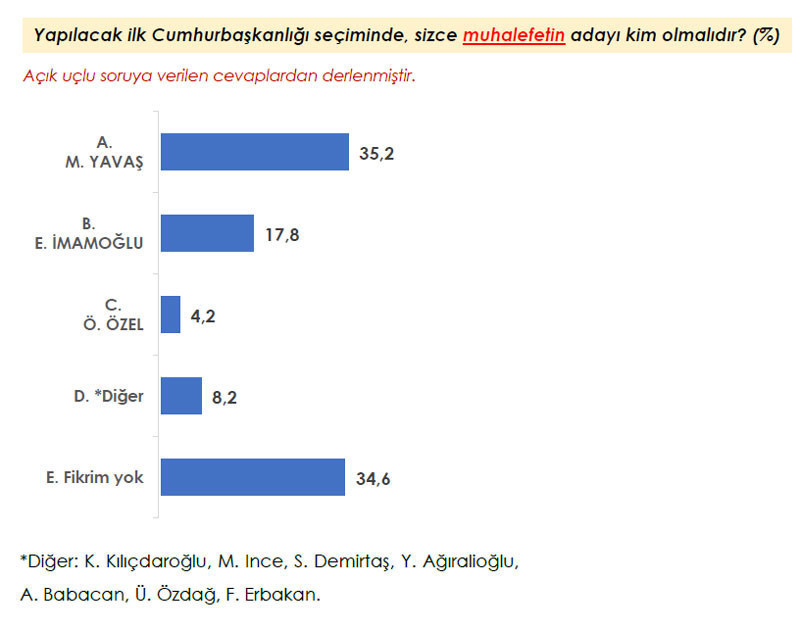 Mansur Yavaş, Cumhurbaşkanı adaylığı ile ilgili ankette de zirvede yer aldı. Katılımcılara "Yapılacak ilk Cumhurbaşkanlığı seçiminde, sizce muhalefetin adayı kim olmalıdır?" sorunun yöneltildiği ankette Yavaş, yüzde 35,2 ile ilk sıraya yerleşti.