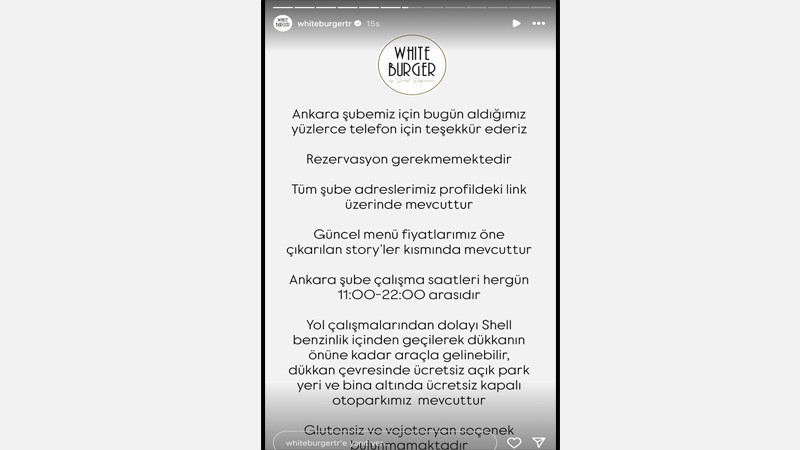 White Burger, çiçeği burnunda Ankara şubesinin açılışının ardından resmi hesaptan bir açıklama yaptı. Yemek yemek için rezervasyon gerekmediği belirtilen açıklamada güncel menü fiyatları hakkında da bilgi verildi. Ankara'daki çalışma saatlerinin ise 11.00-22.00 arasında olduğu hatırlatıldı.