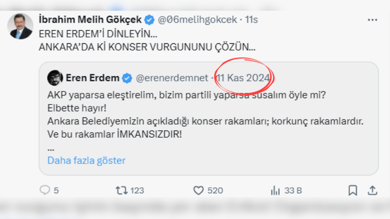 Eski CHP Milletvekili Eren Erdem, 11 Kasım 2024 tarihinde sosyal medya hesabından yaptığı paylaşımda, Ankara Büyükşehir Belediyesinin açıkladığı konser harcamalarına sert tepki gösterdi. “AKP yaparsa eleştirelim, bizim partili yaparsa susalım öyle mi? Elbette hayır!” ifadelerini kullanan Erdem, CHP’li belediyelere yönelik eleştiriler konusunda da çifte standart yapılmaması gerektiğini vurguladı. Belediyenin konser organizasyonlarına ilişkin açıkladığı rakamları “korkunç” ve “imkânsız” olarak nitelendiren Erdem, kamu kaynaklarının her koşulda şeffaf ve hesap verebilir biçimde kullanılması gerektiğinin altını çizdi.