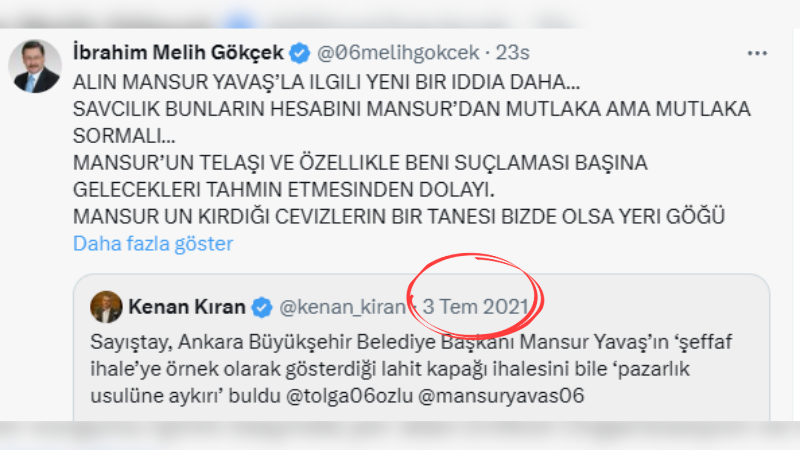 3 Temmuz 2021 tarihinde Sabah gazetesi Yazarı Kenan Kıran, Ankara Büyükşehir Belediye Başkanı Mansur Yavaş’ın “şeffaf ihale” örneği olarak gösterdiği lahit kapağı ihalesinin, Sayıştay tarafından “pazarlık usulüne aykırı” bulunduğunu belirten bir paylaşım yaptı. Bu paylaşımı alıntılayan Melih Gökçek ise sosyal medya hesabından sert açıklamalarda bulundu. “Alın Mansur Yavaş’la ilgili yeni bir iddia daha…” diyerek başlayan paylaşımında Gökçek, savcılığı göreve çağırarak bu tür usulsüzlüklerin mutlaka soruşturulması gerektiğini vurguladı. Mansur Yavaş’ın kendisini suçlamasının, “başına gelecekleri tahmin etmesinden” kaynaklandığını öne süren Gökçek, “Mansur’un kırdığı cevizlerin bir tanesi bizde olsa yeri göğü inletirlerdi.” sözleriyle kamuoyuna çifte standart eleştirisi yöneltti.