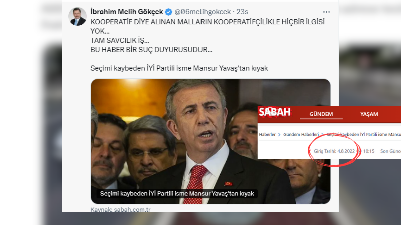 Melih Gökçek, 4 Ağustos 2022 tarihinde Sabah gazetesinde yayımlanan “Seçimi kaybeden İYİ Partili isme Mansur Yavaş'tan kıyak” başlıklı haberi sosyal medya hesabından alıntılayarak Mansur Yavaş yönetimine yönelik eleştirilerine bir yenisini ekledi. Gökçek, paylaşımında “Kooperatif diye alınan malların kooperatifçilikle hiçbir ilgisi yok… Tam savcılık iş… Bu haber bir suç duyurusudur…” ifadelerini kullanarak, belediyenin gerçekleştirdiği bazı alımların usule uygun olmadığını ve siyasi kayırmacılık içerdiğini öne sürdü. Söz konusu haber üzerinden kamu kaynaklarının amacı dışında kullanıldığı imasında bulunan Gökçek, adli makamları harekete geçmeye çağırdı.