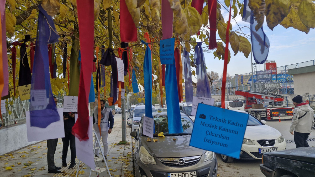 Bakanlık binasının önünde bulunan ağacı “memurun ve emeklinin dilek ağacı”na dönüştüren konfederasyon üyeleri, maaşlardan sosyal haklara kadar birçok talebini tek tek not ederek ağacın dallarına astı.