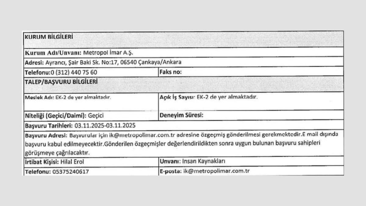 Metropol İmar 4 geçici işçi alımı duyurdu! Başvuru şartları ve detaylar neler?