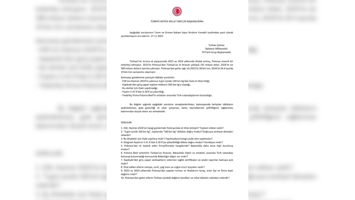 İYİ Parti Balıkesir Milletvekili ve Grup Başkanvekili Turhan Çömez, Et ve Süt Kurumu (ESK) tarafından yürütülen tartışmalı ithalat politikaları hakkında Tarım ve Orman Bakanı İbrahim Yumaklı'nın yanıtlaması istemiyle Türkiye Büyük Millet Meclisine (TBMM) yazılı soru önergesi sundu. Çömez, Türkiye'de yerli üreticinin krize girmesine rağmen hız kesmeyen ithalatın ardında "et çetelerinin" olduğunu ve kurumun tepe yönetiminin çıkar çatışması içinde bulunduğunu iddia etti.
