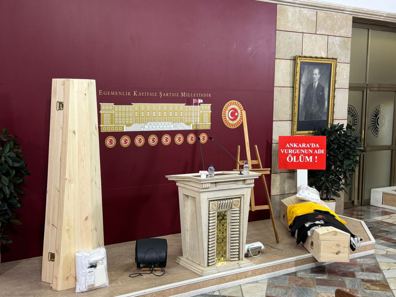 TBMM'de basın açıklaması yapacak olan Osman Gökçek, Meclis'e tabut, ceset torbaları ve kefenle geldi. Malzemeler, basın toplantısının yapılacağı odaya konuldu.