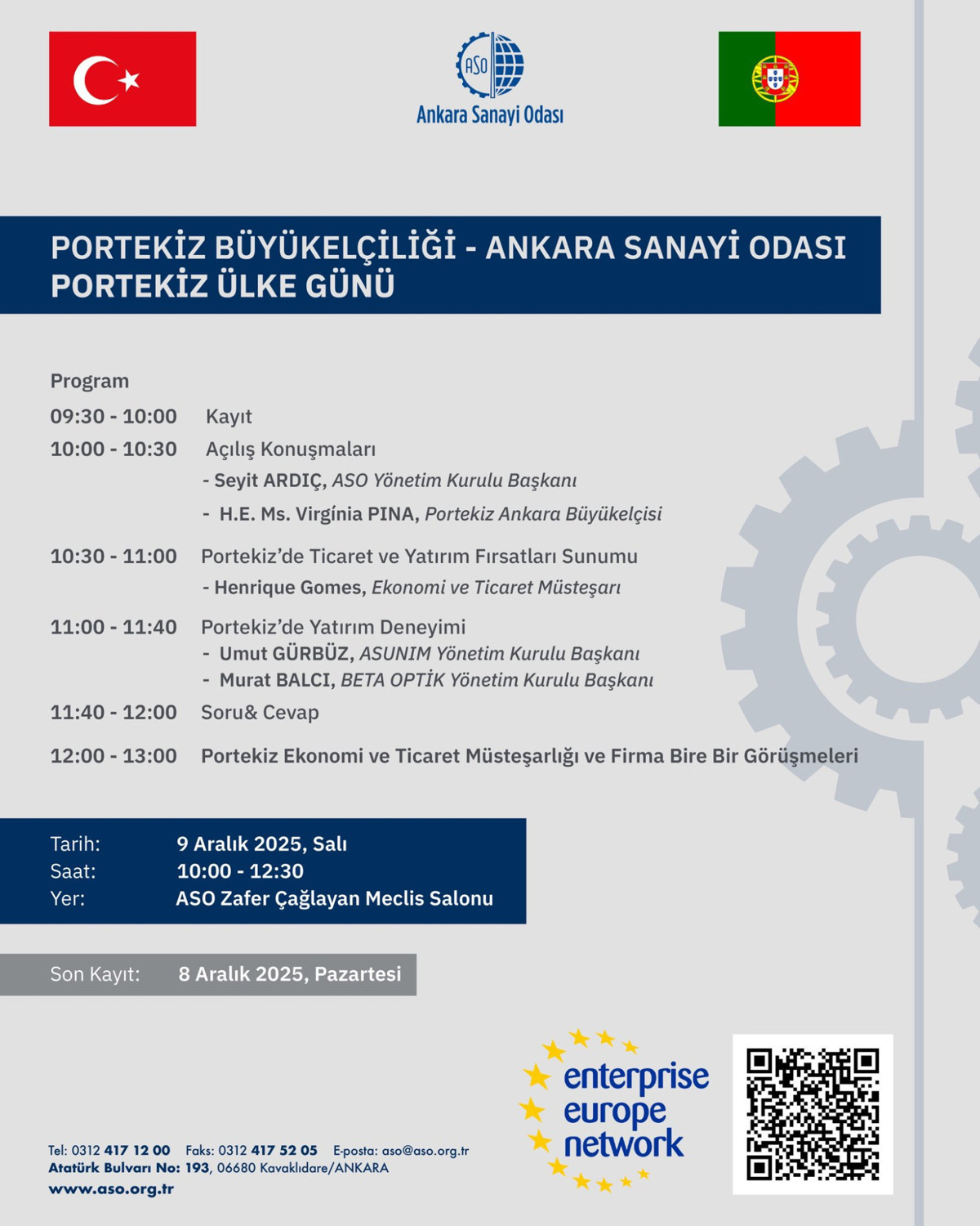 Ankara Sanayi Odası (ASO), Portekiz’in Ankara Büyükelçiliği iş birliğiyle “Portekiz’de Ticaret ve Yatırım Fırsatları” temalı Portekiz Ülke Günü etkinliğine ev sahipliği yapıyor. Etkinlik, sanayi ve iş dünyası temsilcilerini Portekiz pazarındaki fırsatlarla buluşturmayı amaçlıyor.