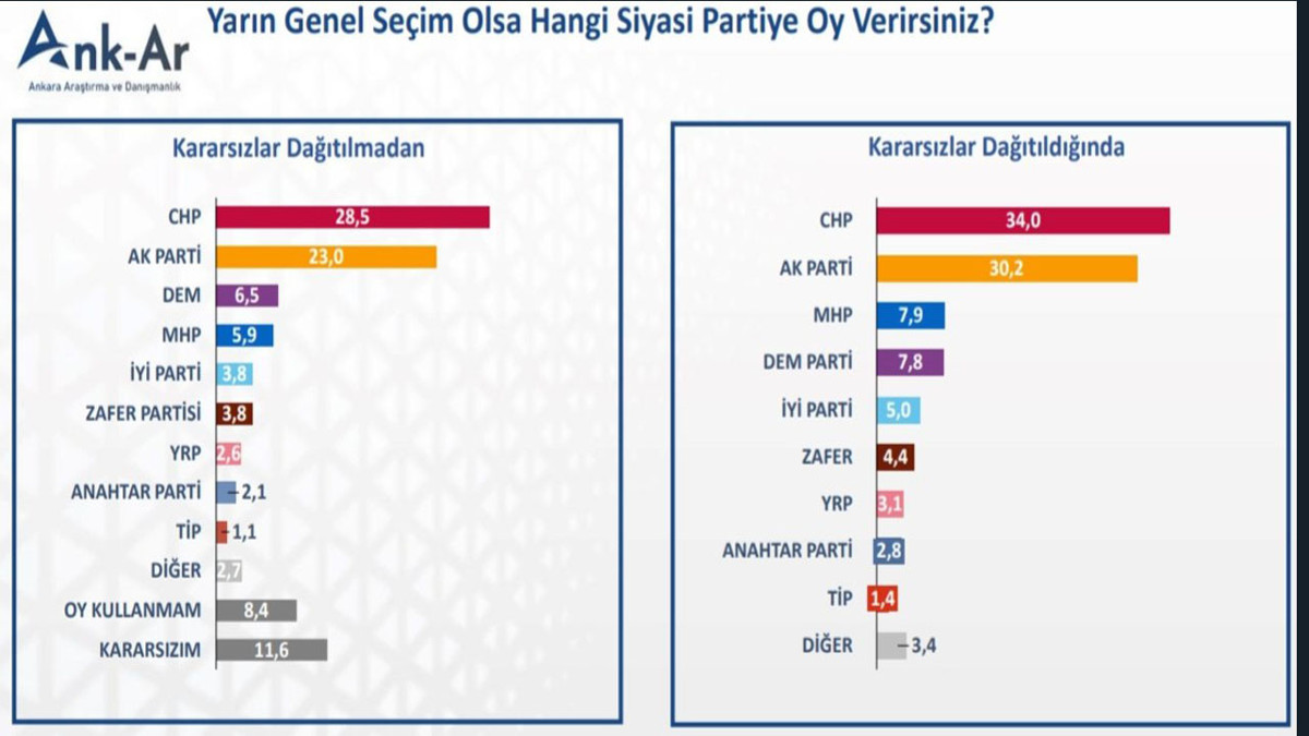 Ankara Araştırma ve Danışmanlık şirketinin 16–19 Ekim 2025 tarihleri arasında yaptığı son genel seçim anketine göre Cumhuriyet Halk Partisi (CHP), Adalet ve Kalkınma Partisinin (AK Parti) 4 puan önünde yer aldı.