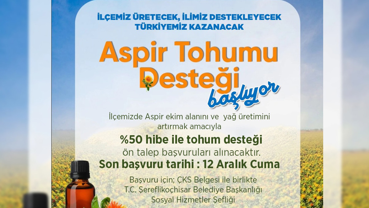 Şereflikoçhisar Belediyesi, ilçedeki üreticilere yönelik aspir tohumu destek programını hayata geçiriyor. Belediye tarafından yapılan açıklamada, tarımsal üretimde çeşitliliği artırmak ve çiftçilere ek gelir imkânı sunmak amacıyla yeni bir destek sürecinin başlatıldığı duyuruldu.
