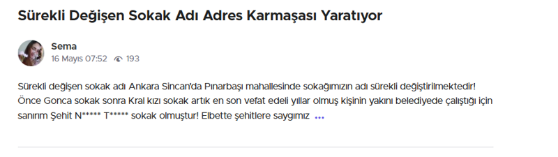 Sema adlı vatandaş, Pınarbaşı Mahallesi’nde yaşadığı sokak isminin defalarca değiştirildiğini ve bu durumun adres karmaşasına yol açtığını söyledi. Son olarak sokağa bir şehit yakınının adı verilmesini olumlu karşılasa da, sürecin keyfi şekilde yürütüldüğünü öne sürdü.