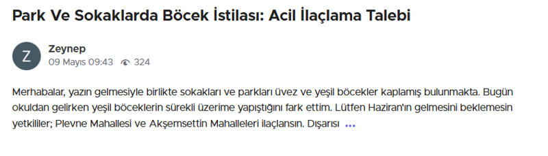 Zeynep isimli kullanıcı, Plevne ve Akşemsettin Mahalleleri'nde parklarda yoğun böcek istilası yaşandığını, yeşil böceklerin özellikle çocuklar ve öğrenciler için tehdit oluşturduğunu yazdı. Acil ilaçlama çağrısında bulundu.