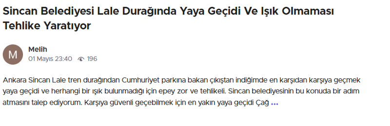 Lale tren durağı yakınında ışık ve yaya geçidi bulunmadığını belirten Melih adlı kullanıcı, vatandaşların karşıya geçmekte zorluk yaşadığını ve güvenlik riski olduğunu ifade etti.