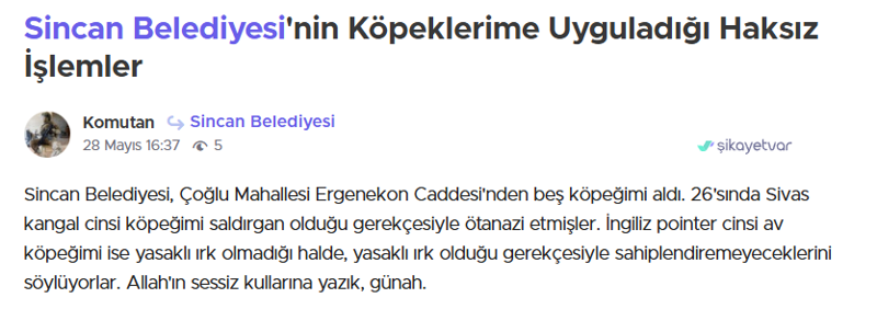 28 Mayıs’ta Komutan kullanıcı adlı vatandaş, Çoğlu Mahallesi Ergenekon Caddesi’nde beslediği beş köpeğine belediye tarafından el konulduğunu, 26 Mayıs’ta ise Sivas kangal cinsi köpeğinin “saldırgan” denilerek ötanazi edildiğini belirtti. İngiliz pointer cinsi av köpeğinin ise yasaklı ırk olmadığı hâlde sahiplendirme yapılmadığını ifade ederek haksız uygulamalara maruz kaldığını dile getirdi.