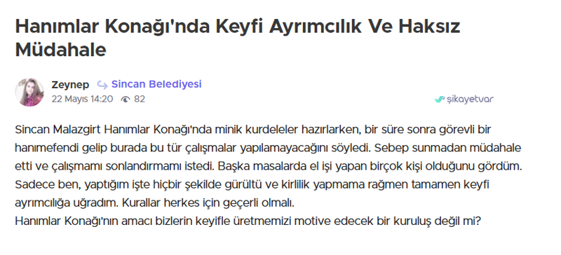Malazgirt Hanımlar Konağı’nda el işi yaptığı sırada çalışmasına son verilmek istendiğini belirten bir diğer Zeynep isimli kullanıcı, görevlinin sebep göstermeden müdahale ettiğini ve diğer kadınların çalışmalarına karışılmadığını dile getirdi.