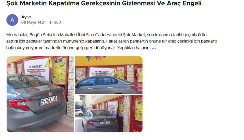 Ayşe isimli vatandaş, Selçuklu Mahallesi’nde mühürlenen bir marketin neden kapatıldığını belirten afişin, bilinçli olarak araçla kapatıldığını iddia etti. “Halkın bilgi alma hakkı engelleniyor” diyerek şeffaflığa dikkat çekti.