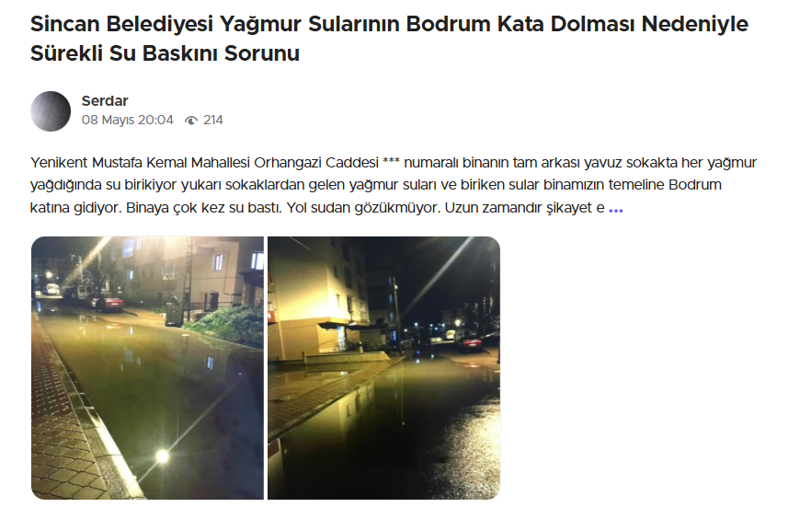 Yenikent Mustafa Kemal Mahallesi'nde oturan Serdar isimli kullanıcı, her yağmur sonrası bodrum katlarını su bastığını söyledi. Yağmur sularının yukarıdan sokaklara aktığını ve çözüm için uzun süredir başvuru yaptığını belirtti.