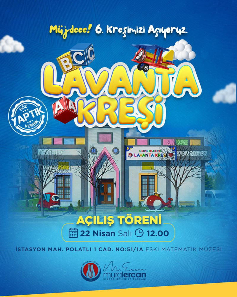 Sincan Belediyesi, çocuklara yönelik eğitim ve bakım hizmetlerini genişletmeye devam ediyor. Bu kapsamda ilçedeki 6. kreş olan Lavanta Kreşi, düzenlenecek törenle kapılarını açıyor.