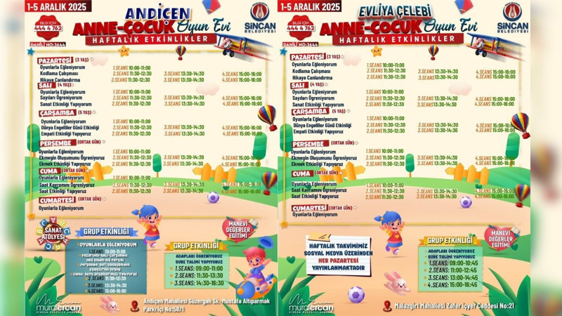 Sincan'ın Evliya Çelebi, Plevne, Andicen ve Ertuğrul Gazi Anne-Çocuk Oyun Evleri, 3 ila 5 yaş aralığındaki minikler için haftayı macera dolu bir öğrenme serüvenine dönüştürüyor. 3 yaş grupları kodlama ve hikaye canlandırma ile başlarken, 4 yaş grupları sayılar ve sanatsal etkinliklerle öğreniyor. 5 yaş grubu ise Çarşamba günü Dünya Engelliler Günü'ne özel empati etkinliği ile sosyal farkındalık kazanacak.