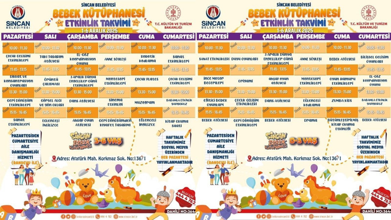 Sincan Belediyesi Bebek Kütüphanesi, 0-3 ve 3-6 yaş gruplarına özel iki ayrı programla erken çocukluk gelişimine odaklanıyor. Pazartesiden Cumartesiye randevuyla Aile Danışmanlığı Hizmeti sunuluyor olması, programın bütüncül yaklaşımını gösteriyor.