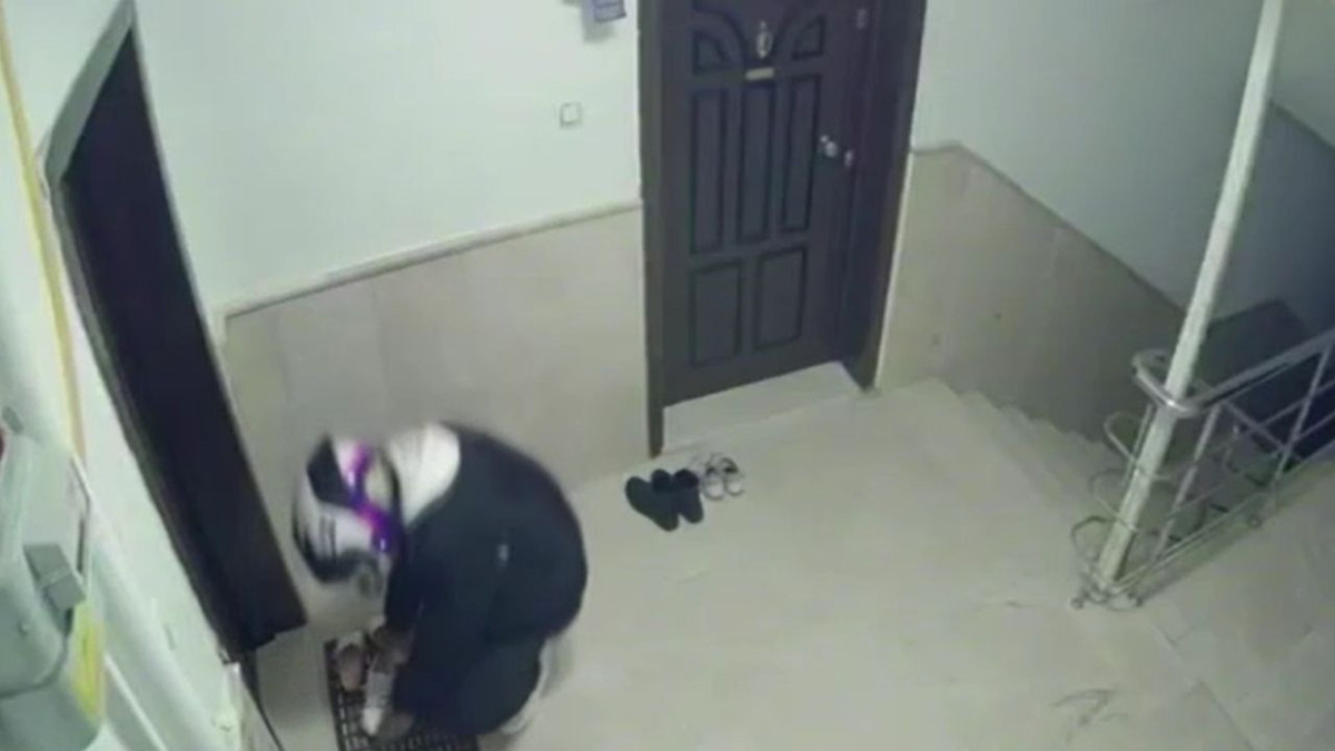 Ankara'nın Sincan ilçesinde, yemek siparişi getiren bir kuryenin, siparişi teslim ettikten sonra bir dairenin kapısının önündeki ayakkabıları çaldığı anlar güvenlik kamerasına yansıdı.