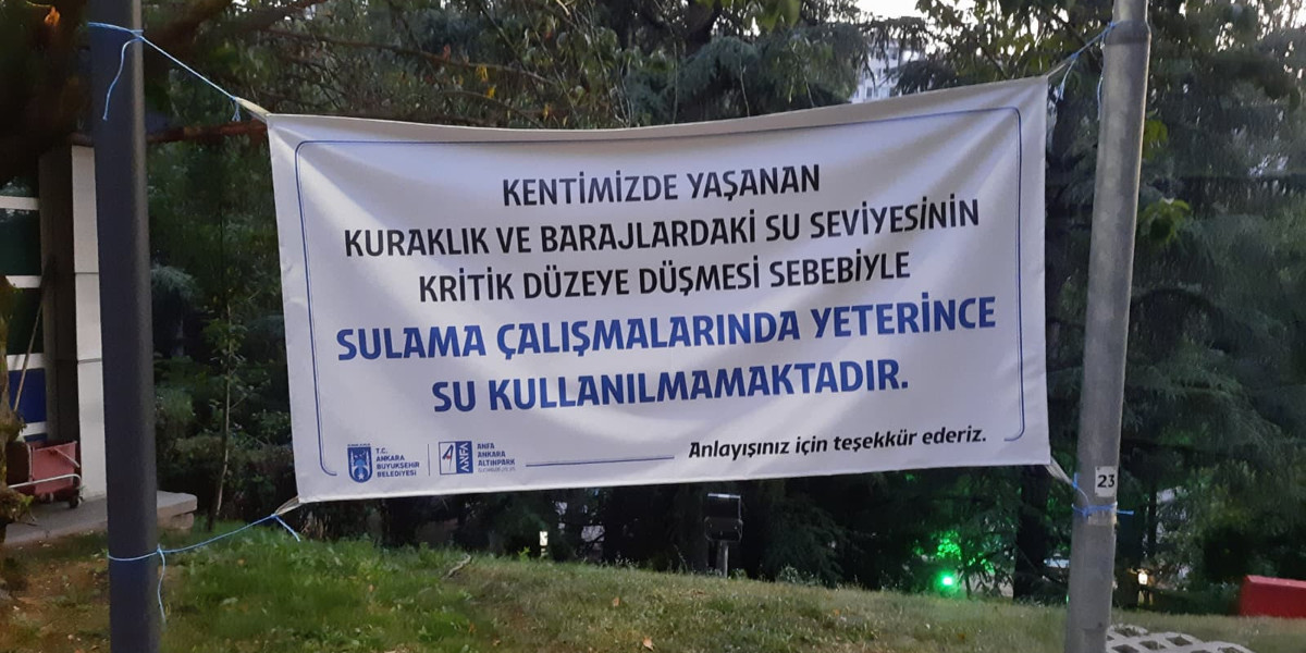 Dikmen Vadisi’ne asılan bir pankartta, “Barajlardaki su eksikliği nedeniyle parklarda sulama çalışmalarında yeterince su kullanılmamaktadır" uyarısı yapıldı.