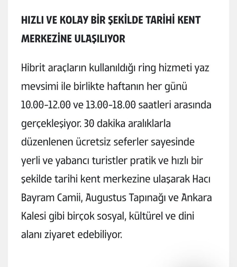 Hibrit araçların kullanıldığı ring hizmeti yaz mevsimi ile birlikte haftanın her günü 10.00-12.00 ve 13.00-18.00 saatleri arasında gerçekleşiyor. 30 dakika aralıklarla düzenlenen ücretsiz seferler sayesinde yerli ve yabancı turistler pratik ve hızlı bir şekilde tarihi kent merkezine ulaşarak Hacı Bayram Camii, Augustus Tapınağı ve Ankara Kalesi gibi birçok sosyal, kültürel ve dini alanı ziyaret edebiliyor.