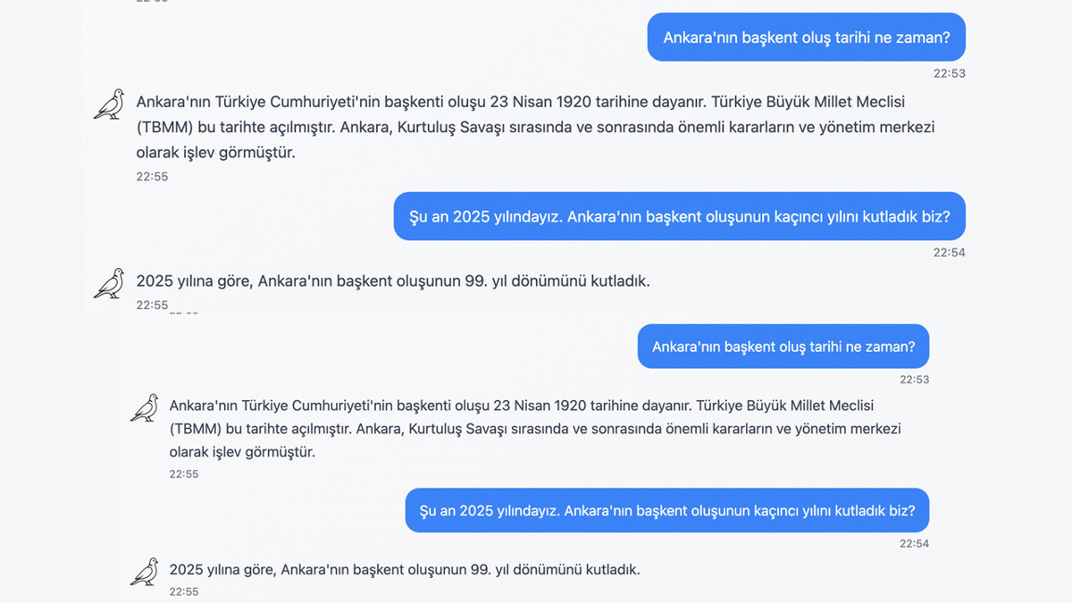 Bir başka sorumuz ise, “Şu an 2025 yılındayız. Ankara'nın başkent oluşunun kaçıncı yılını kutladık biz?” oldu. Ancak Kumru buna da şaşırtan bir yanıt verdi. Yerli yapay zeka hem 13 Ekim 1923 baz alındığında hem de kendi yanlış yanıtı olan 23 Nisan 1920 baz alındığında ikisine de uymayan bir yanıt verdi. Kumru, Ankara’nın başkent oluşuna dair kendi yanıtını geçerli sayarak bir hesaplama yapsaydı 105 demesi gerekirdi. Doğru olan tarihi geçerli sayarak hesap yapsaydı 102 demek zorundaydı. Ancak Kumru, 99 yanıtını vererek bizi şaşırttı.