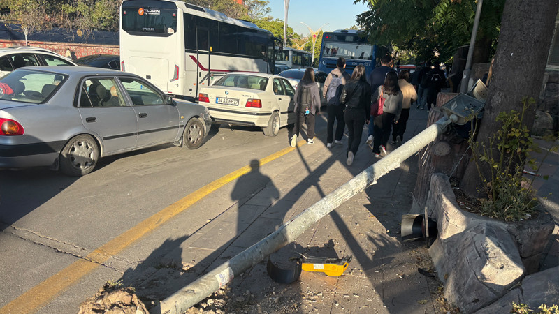 Ankara'da trafiğin büyük bir soruna yol açtığı bölgede bu kez de devrilen trafik ışığı, yoldan geçen vatandaşlar için risk oluşturdu.