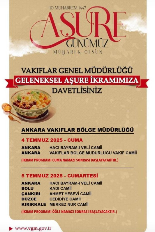 Kültür ve Turizm Bakanlığı ile Vakıflar Genel Müdürlüğünün ortaklaşa yürüttüğü 10 Muharrem 1447 Aşure Günü etkinlikleri bu yıl da vatandaşları bir araya getirecek. Etkinlik kapsamında, 4 Temmuz Cuma günü Cuma namazının ardından Ankara’da Hacı Bayram Veli Camii ile Vakıflar Bölge Müdürlüğü Vakıf Camii önünde aşure ikramı yapılacak.